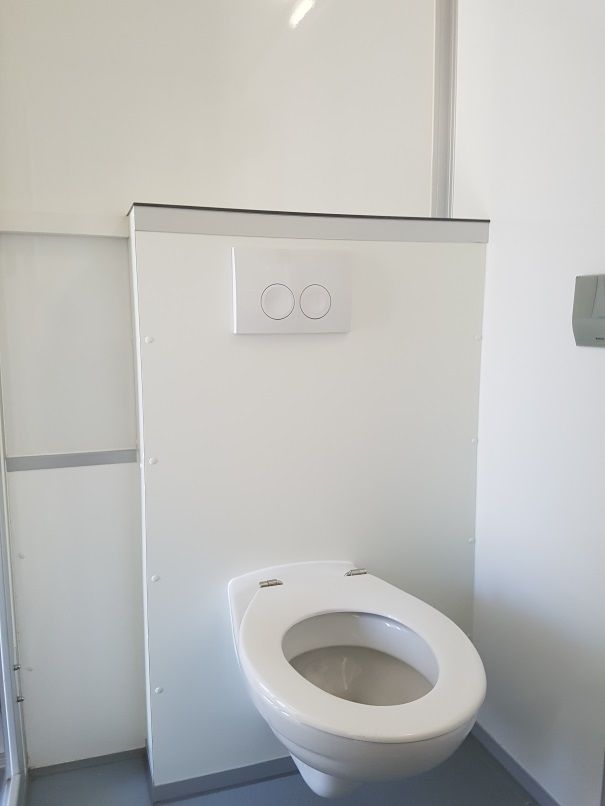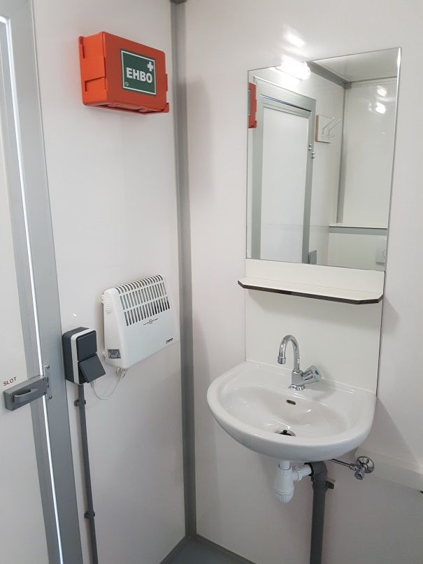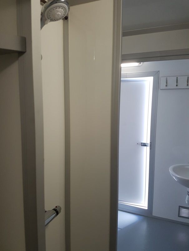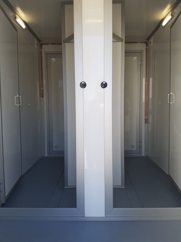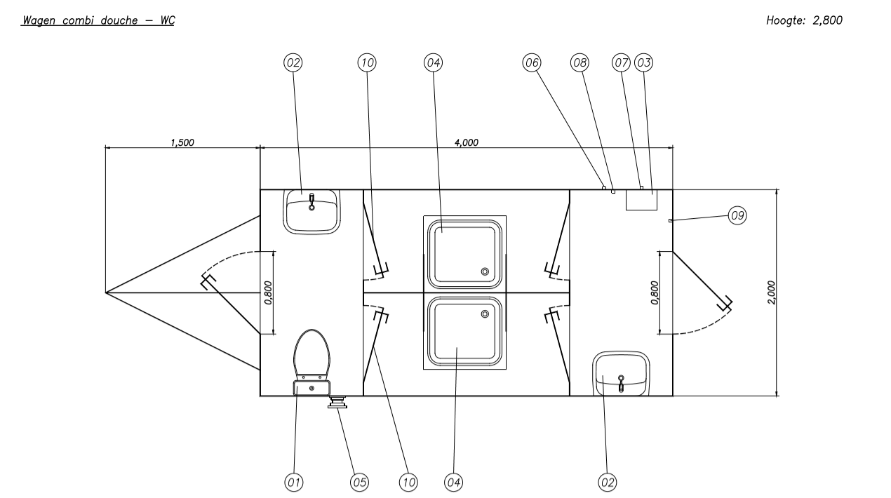 Deze badkamer op wielen is ideaal voor mensen die tijdens hun verbouwing toch een eigen, comfortabele sanitaire unit tot hun beschikking willen hebben. De wagen biedt zelfs de mogelijkheid tot het aansluiten van een wasmachine. Door deze specifieke indeling kan deze wagen perfect functioneren als een “doorloopdouche” d.w.z. in de vorm van : uitkleedruimte – douche – aankleedruimte (zie technisch tekening). Deze wagen kan zowel met 1 centrale ingang gebruikt worden (voor mobiele badkamer), als met 2 aparte ingangen voor douche en WC gescheiden voor bijvoorbeeld een evenement waar privacy gewenst is.