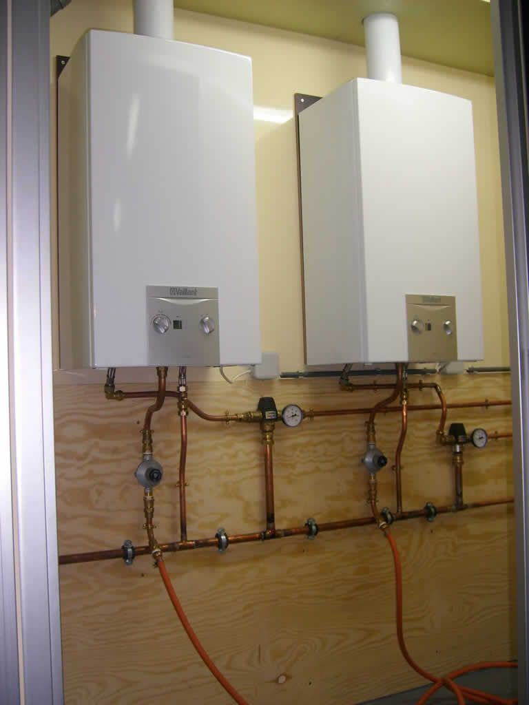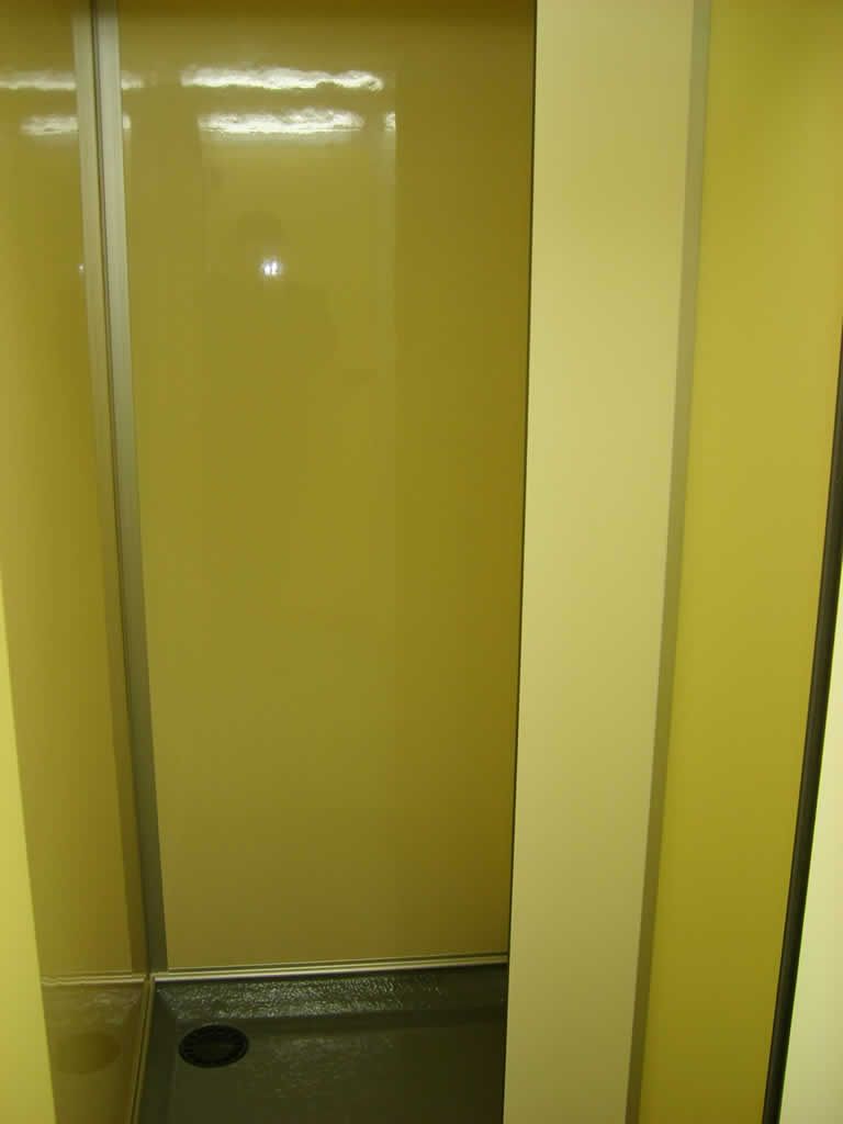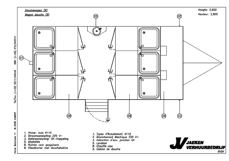 01. Afvoer : buis diameter 110 02. Stroomaansluiting 220 V ~ 03. Wateraansluiting : GK - Koppeling 05. Wastafels 08. Ruimte voor gasgeisers 09. Kleedkamer met douche