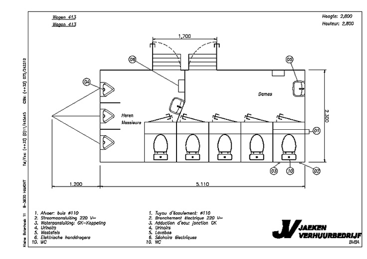 01. Afvoer : buis diameter 110 02. Stroomaansluiting 220 V ~ 03. Wateraansluiting : GK - Koppeling 04. Urinoirs 05. Wastafels 06. Elektrishce handdrogers 10. WC